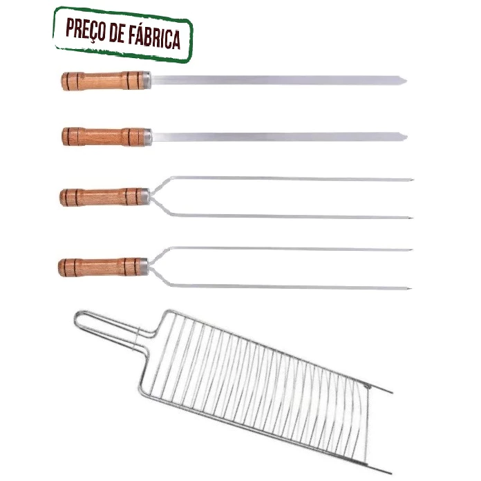 Kit Churrasco Grelha Dupla + 4 Espetos Cabo Madeira 65cm