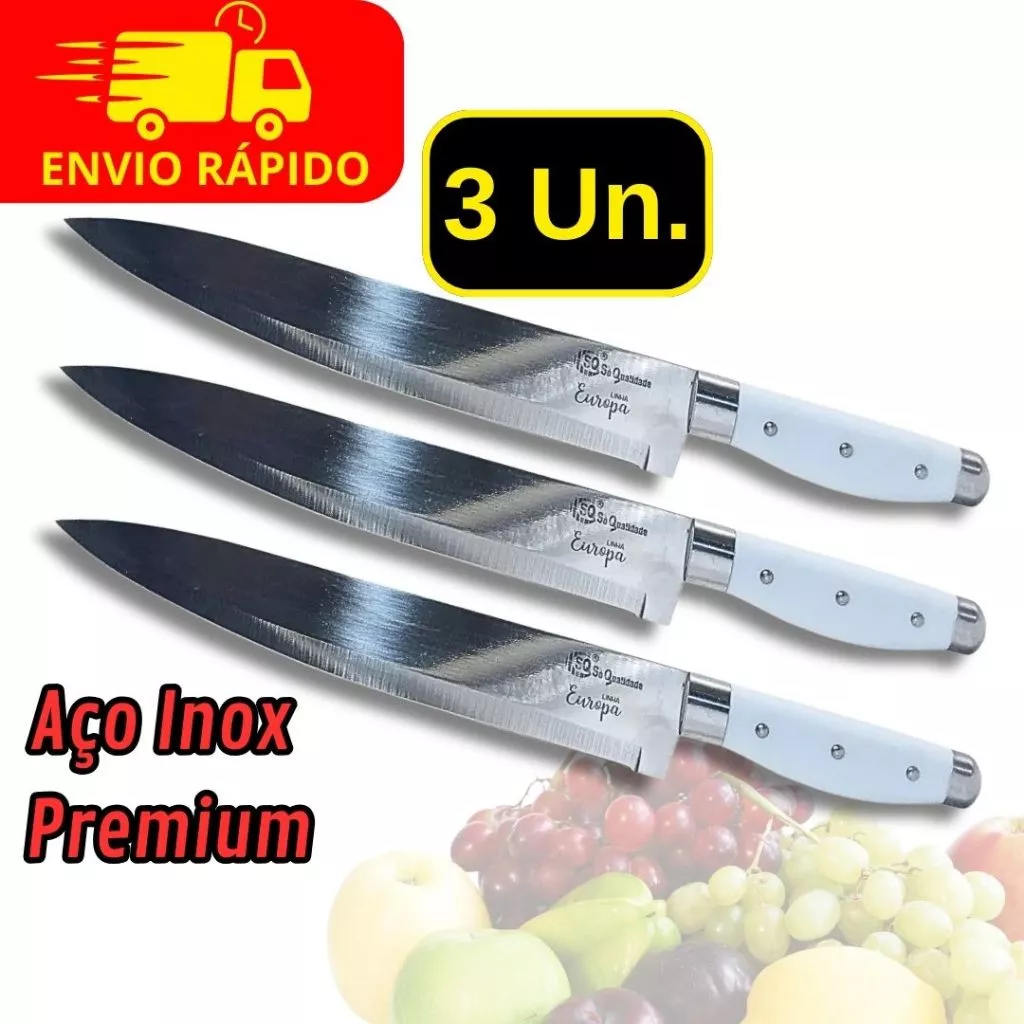 Kit 3 Faca Aço Inox 8 Polegadas 34cm