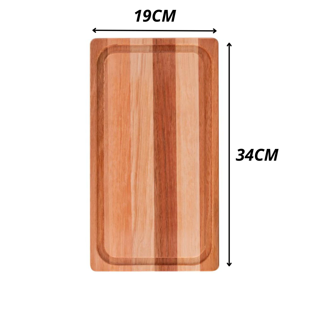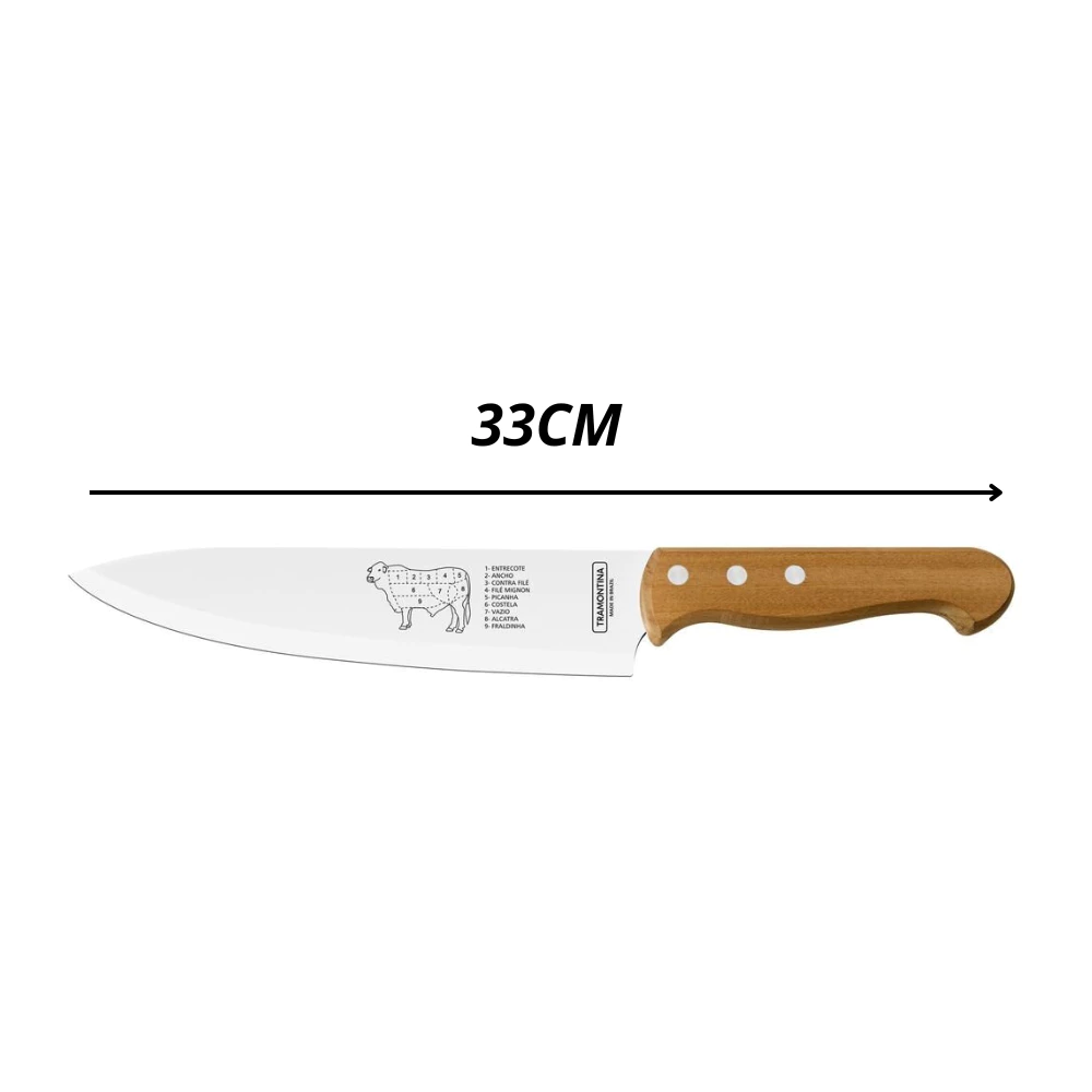 KIT com: – Tábua de madeira – Faca 8′ Inox para churrasco Medidas: – Tábua: 34cm x 19cm – Faca: 33cm