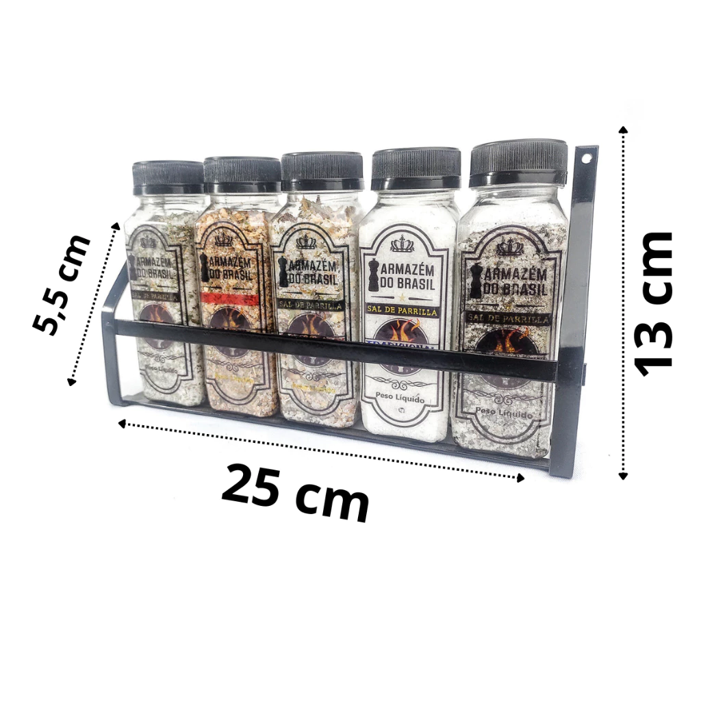 ACOMPANHAM: 1- Suporte de ferro ( 25 cm comp. x 5,5 cm larg. X 13 alt.) — 1 par de parafuso e bucha 2- 5 potes plástico contendo: sal de parrilla tradicional 3- sal de parrilla tradicional 200 g. — sal de parrilla com alho 200 g. s– sal de parrilla com pimenta 200 g. — sal de parrilla com chimichurri 200 g. — Dry Rub 160 g.